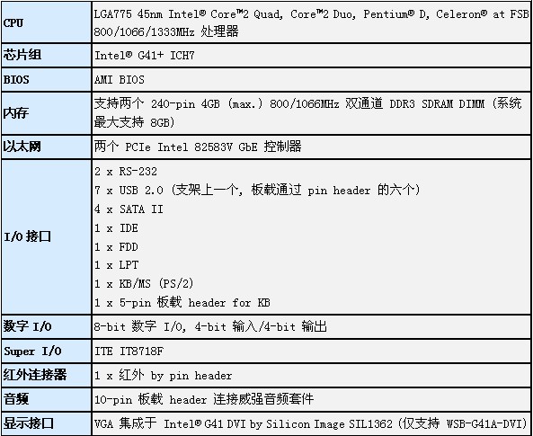 持 Intel® G41 LGA775 Intel® Core2™ Quad CPU 支持 VGA, DDR3, WSB-G41A Dual PCIe GbE, SATA II, COM, USB 2.0 和音频, RoHS