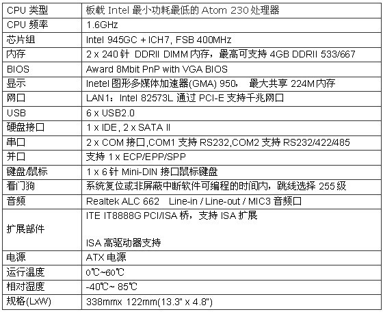 · 板载英特尔凌动230处理器(1.6G/4W),FSB 533MHz