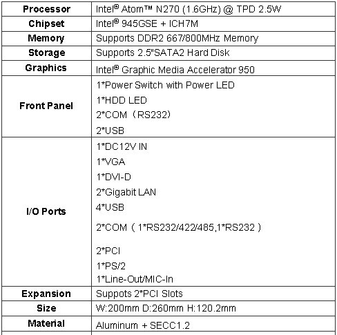 · 板载Intel® Atom N270 1.6GHz