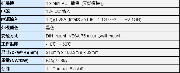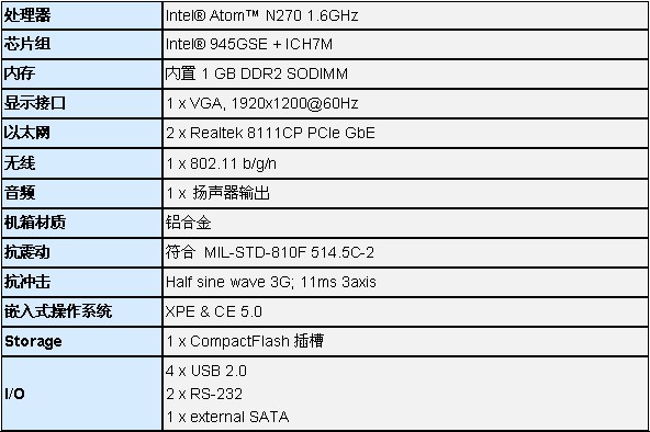 ·Intel® Atom™ N270 1.6GHz解决方案 ·Intel® Graphics Media A ccelerator 950 支持更好的图像处理功能 ·支持超线程技术 ·无风扇系统支持 -10°C ~ 50°C