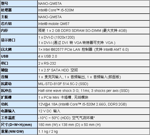 ·支持Intel® 32 nm 移动处理器 Intel® Core™ i5-520M ·支持双DVI独立显示 ·可支持 DDR3 800/1066 MHz 最大至 4GB ·支持 Intel® GbE LAN 和 Intel® AMT 6.0 技术 ·12V DC电源输入 ·可选无线 (PCIe Mini 卡)