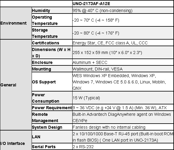 UNO-2173AF是一款无风扇嵌入式工业电脑,支持Mini-PCIe扩展,串行通讯端口和其他一些网络接口。UNO-2173AF支持Windows XP Embedded操作系统和Windows CE 5.0 & 6.0,并且已经通过Energy Star认证,支持IP-40等级防尘保护和宽温操作(-20 ~ 70° C),充分满足了工业自动化应用的低功耗且经济有效的需求,完美呈现出高性能低功耗的卓越品质。