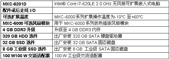 Matrix MXC-6201D是一款功能强大的无风扇可扩展嵌入式电脑,它使用新型的Intel® Core i7 2.0GHz处理器,可以为您的应用提供更高的计算性能。MXC-6201D继承了Matrix C系列的特点,采用了独特的无风扇和无电缆设计。MXC-6201D采用Intel® Core i7 2.0 GHz处理器和Intel® QM57芯片组,性能更加强大,是图像和视觉测量以及自动化应用的理想选择。由于配备了PCI和PCIe插槽,可以集成常用的PCI/PCIe插卡,因此MXC-6201D是可配置的应用平台。其内置的16通道隔离数字输入输出通道可用于通用工业控制,而位于前面板上的DVI-D输出则使其可以直接连接到LCD显示面板。此外,MXC-6201D还提供了一个eSATA端口,因而具有扩展存储容量或使用可热插拔SATA驱动器的能力。