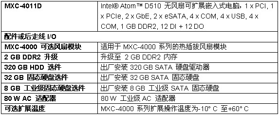 Matrix MXC-4011D是一款基于Intel® Atom™ D510 双核处理器的无风扇可扩展嵌入式电脑,具有强大的运算能力。MXC-4011D沿袭了现有的MXC系列无风扇,无线缆设计的特性,并增加了一些全新的特点,如一个eSATA接口,一个LVDS输出和一个选配的可热插拔的风。