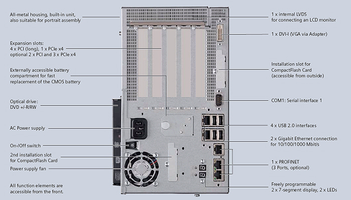 为了实现特别紧凑的解决方案(例如在控制机柜中),箱式 PC 827B 也可以安装在节省空间的直插式组装中。为了实现需要低维护、高可用性和无需硬盘的系统的组装,需要提供两个闪存插槽,这两个槽可以从外部轻松操作。通过将内存扩展至 4 GB,可顺利控制数据密集型应用程序。SIMATIC 箱式 PC 827B 是 SIMATIC 箱式 PC 627B 的“前身”,它们具有相同的空间占用面积、相同的接口和图像兼容性